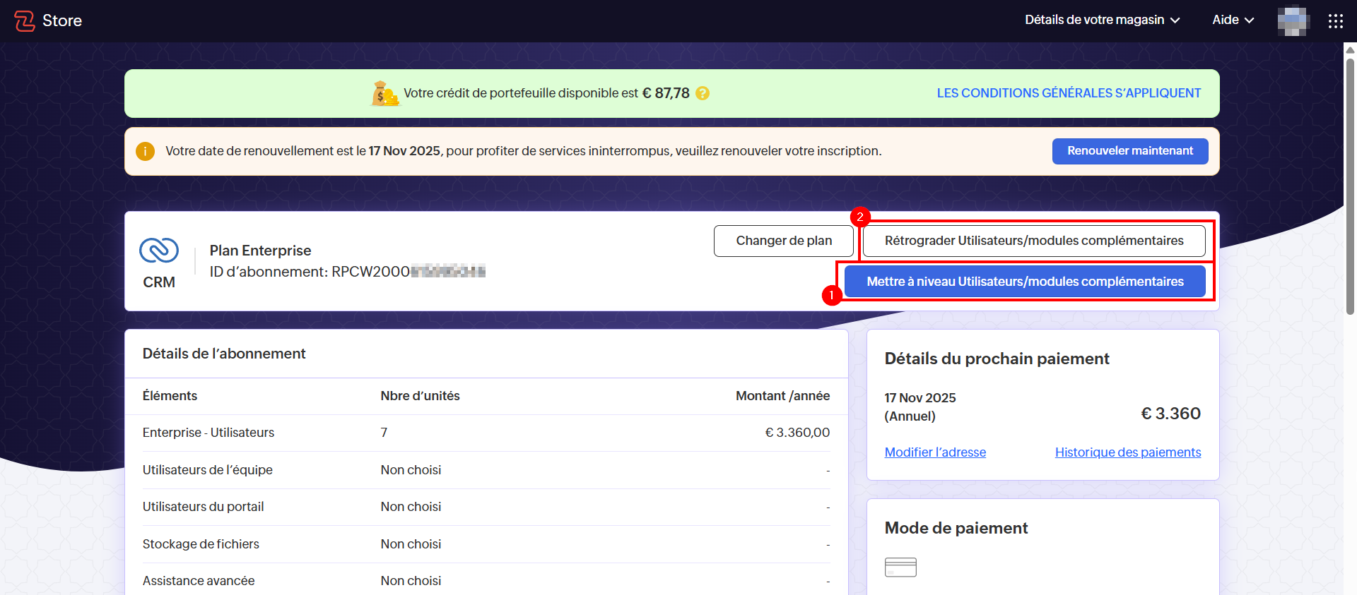Pour ajouter ou supprimer une licence Zoho CRM, suivez la procédure ci-dessous.